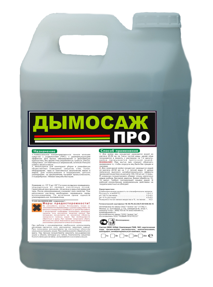 Щелочное концентрированное средство ДЫМОСАЖ с ингибитором коррозии и дезинфицирующим бензалконием с сильным обезжиривающим дезинфицирующим и антибактериальным эффектом.